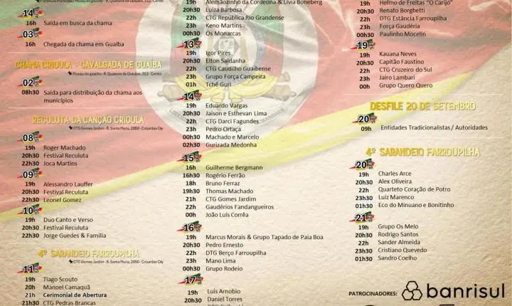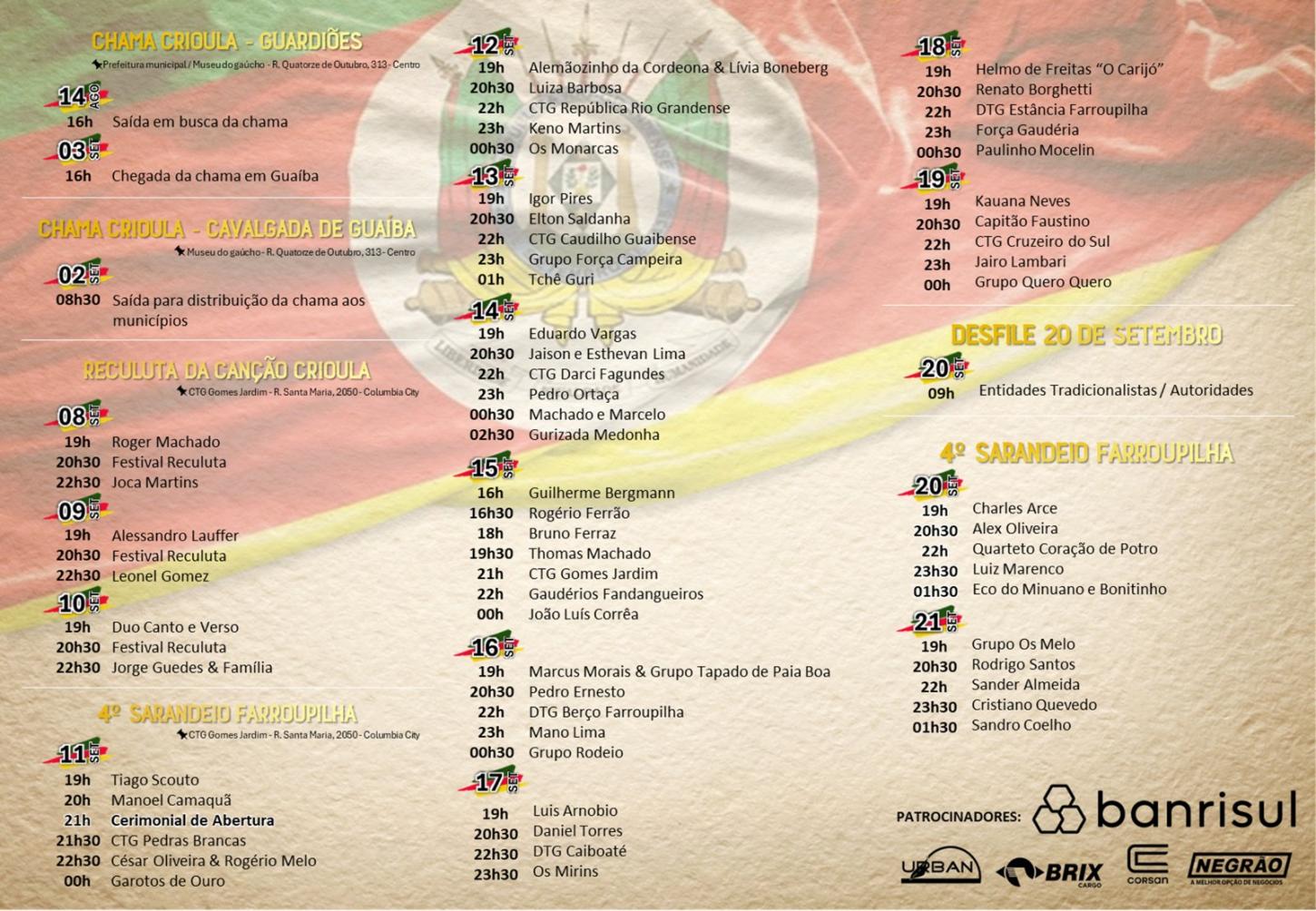 - 21h: Cerimônia oficial de abertura do Sarandeio Farroupilha e das festividades farroupilhas em Guaíba.