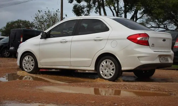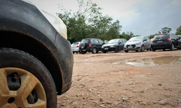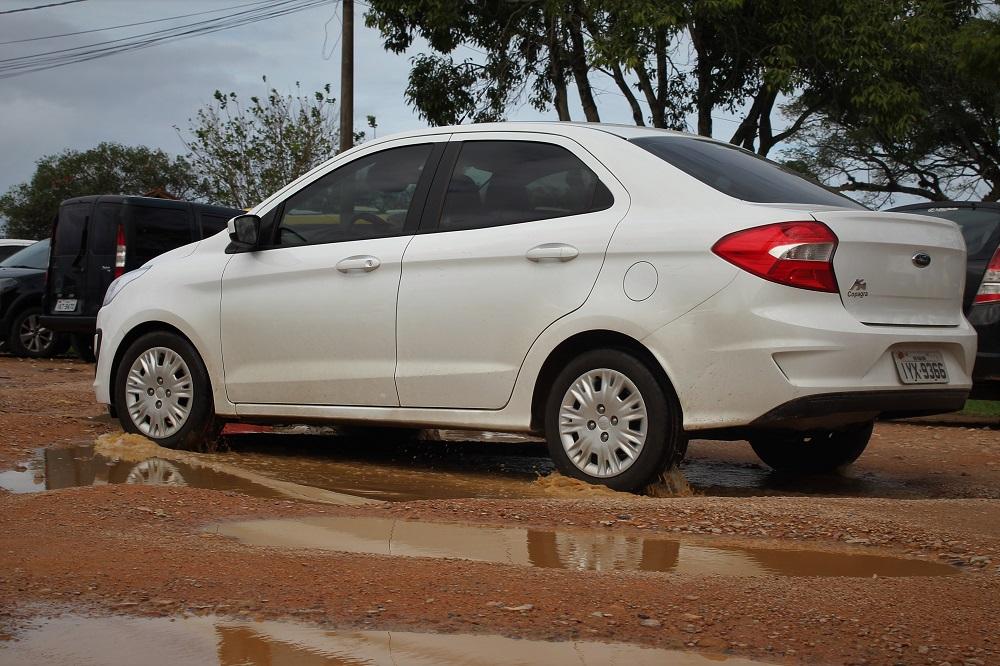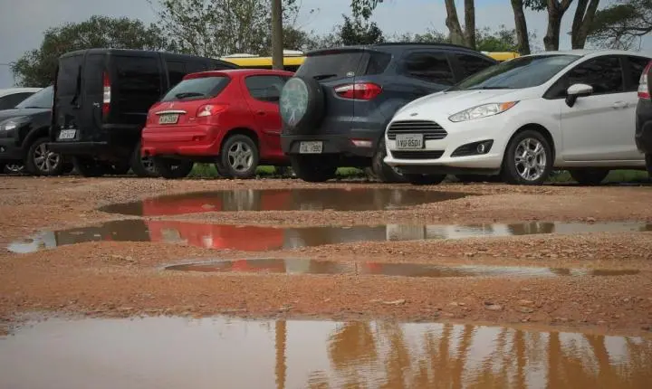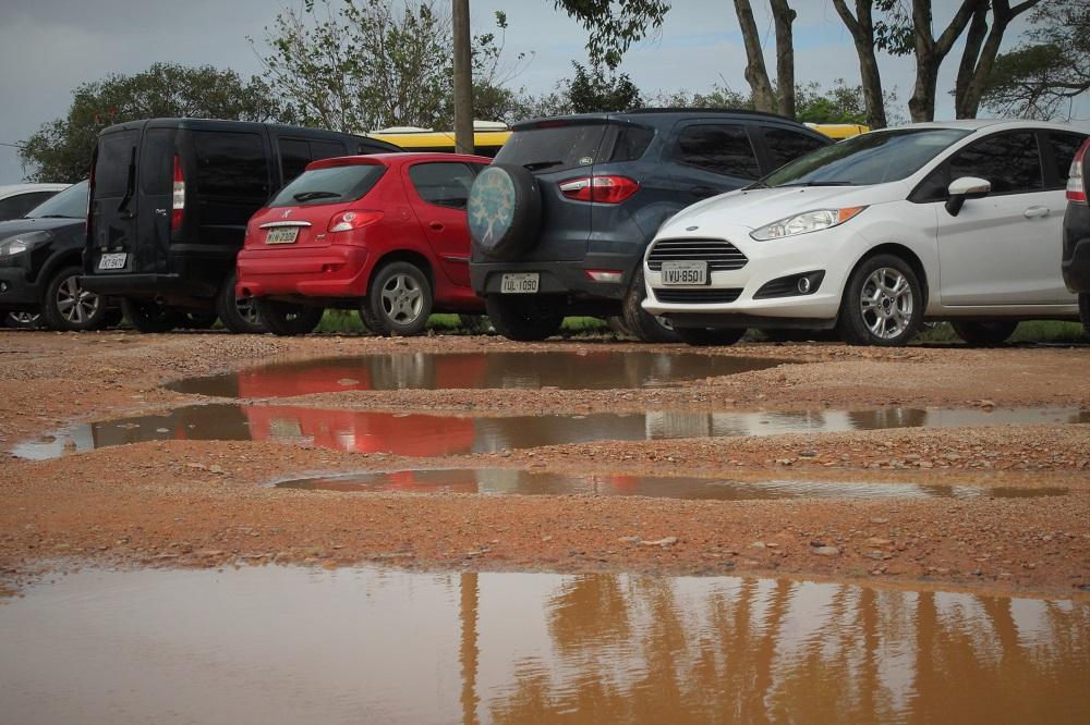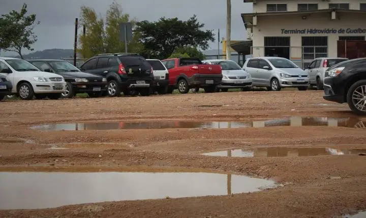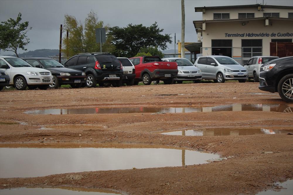 A semana começou com chuva em Guaíba. Após ela, é natural que aconteça acumulação de água na área em frente à hidroviária da cidade, no Centro. O local serve como estacionamento de veículos para aqueles que viajam para Porto Alegre de catamarã. Fica alagada com diversos buracos d’água com prejuízos aos veículos. A área não tem proprietário.