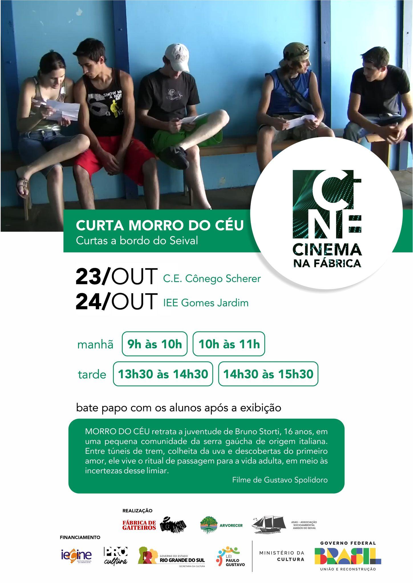 Durante o evento, serão exibidos curtas-metragens, entre eles o documentário “Morro do Céu”, do diretor Gustavo Spolidoro, que retrata a juventude rural na Serra Gaúcha. O filme acompanha Bruno Storti, de 16 anos, em seu cotidiano em uma comunidade de origem italiana, mostrando o convívio com amigos, o trabalho na colheita da uva e o processo de amadurecimento diante das transformações da adolescência. Após as sessões, os alunos participam de conversas sobre as produções apresentadas.