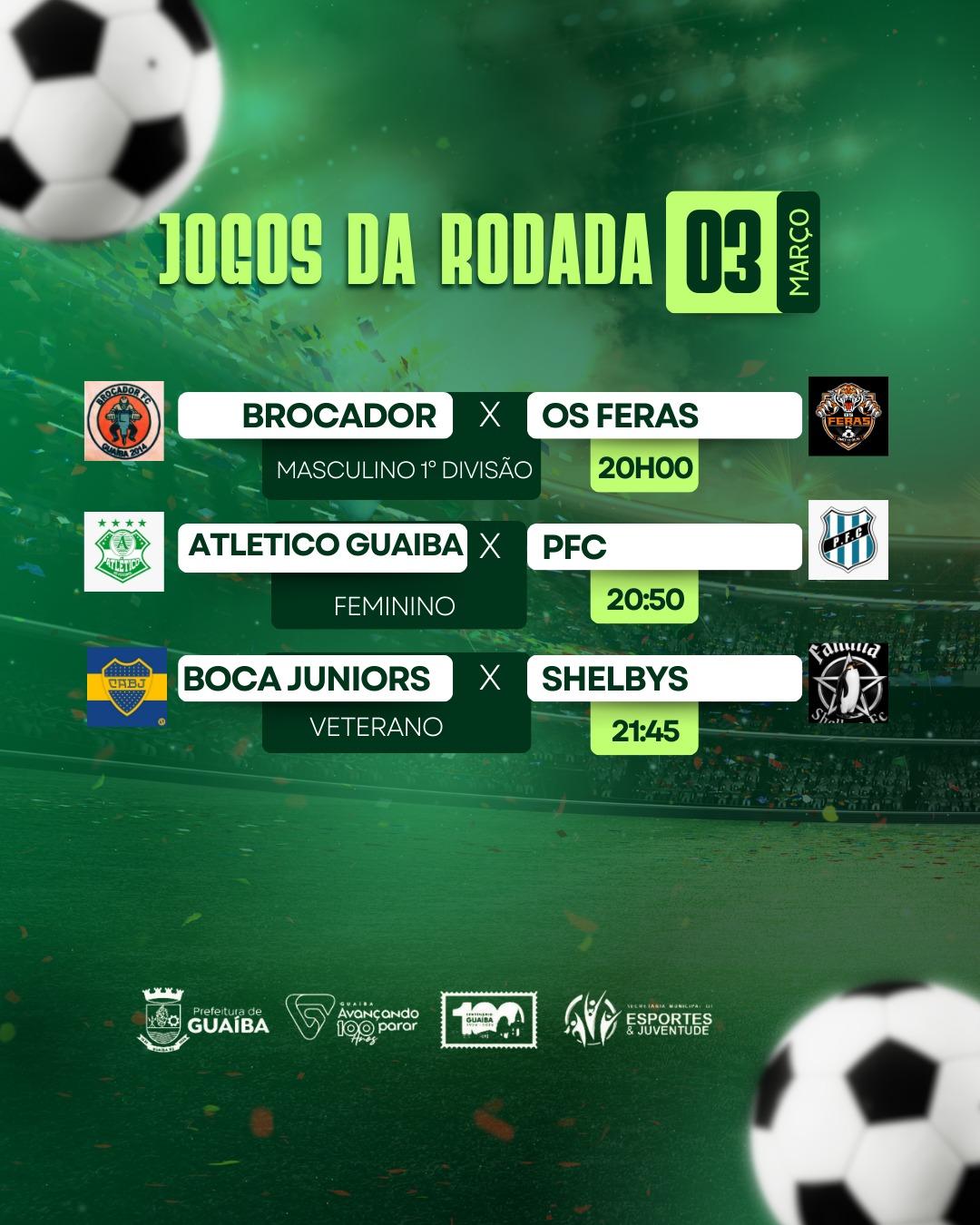 Os jogos da rodada inaugural estão programados para o Complexo Esportivo Coelhão. Às 20h, pela 1ª divisão masculina, Brocador enfrenta Os Feras. Às 20h50, pela categoria feminino, Atlético Guaíba joga contra o PFC. Às 21h45, pela categoria veterano, Boca Juniors enfrenta o Shelbys.