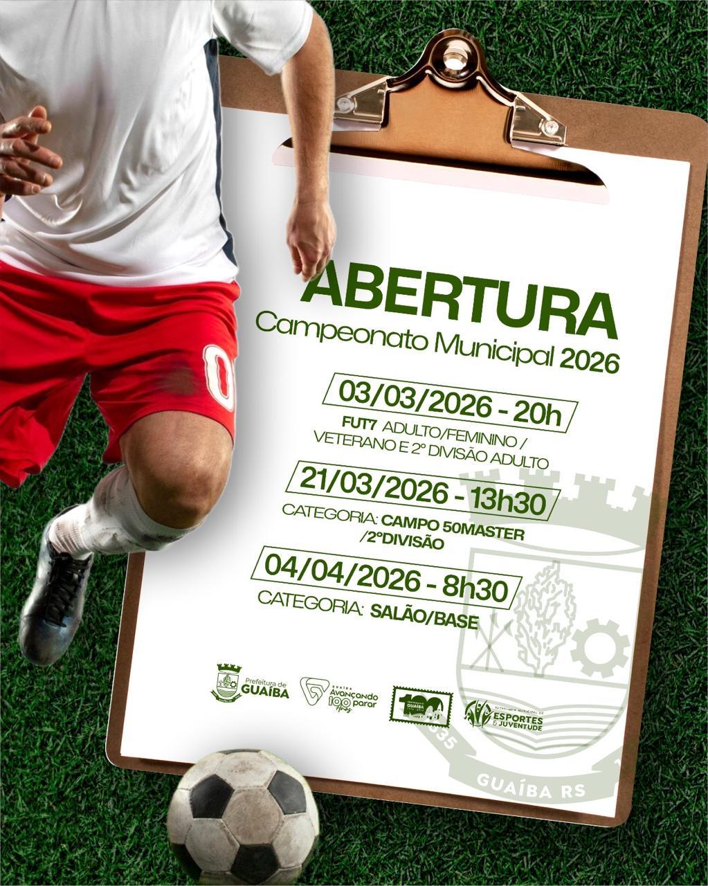 A Prefeitura de Guaíba, por meio da Secretaria de Esportes e Juventude, realiza nesta terça-feira (3), às 20h, a abertura do Campeonato Municipal 2026. A primeira rodada contempla a categoria futebol sete (society), com disputas nas divisões adulto, feminino, veterano e 1ª divisão adulto.