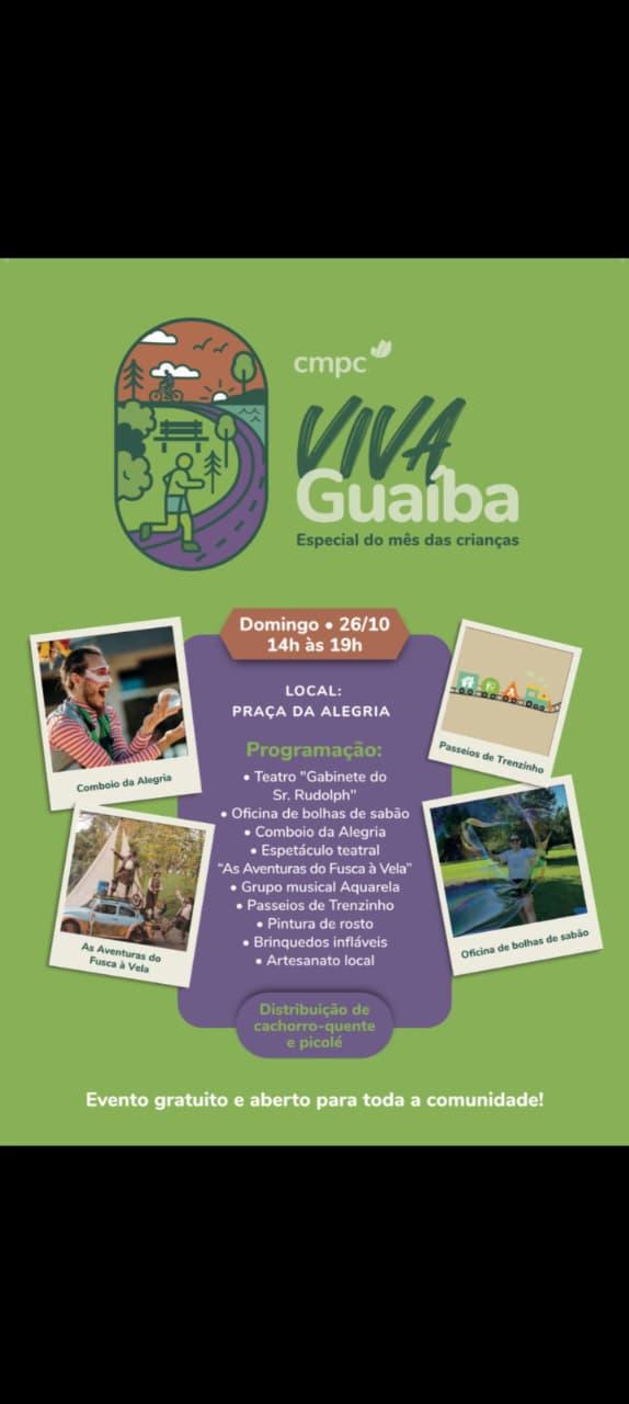 Neste domingo, dia 26 de outubro, Guaíba recebe mais uma edição do projeto Viva Guaíba, promovido pela CMPC, com uma programação especial dedicada ao mês das crianças. As atividades acontecem na Praça da Alegria, das 14h às 19h, e são gratuitas e abertas à comunidade.