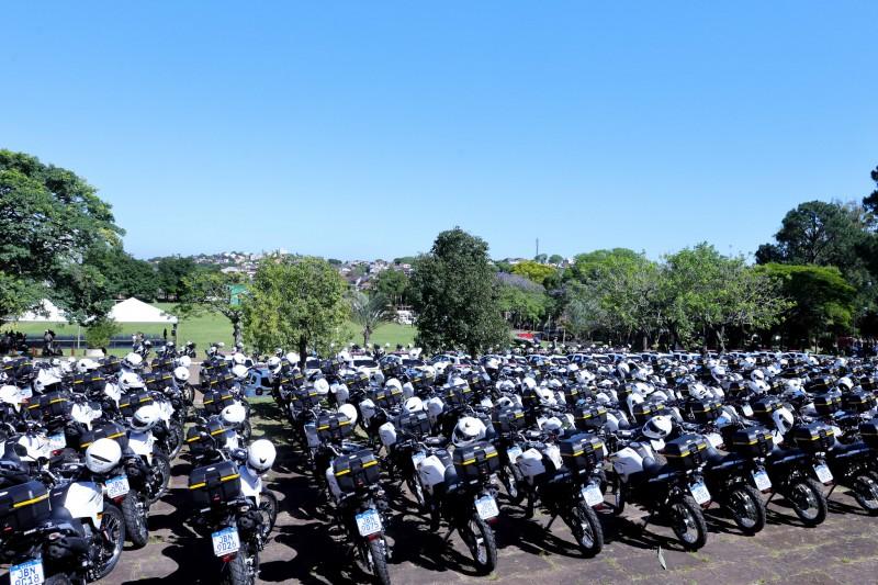 O Governo do RS entregou, na manhã desta sexta-feira (17/11), na Academia de Polícia Militar (APM), em Porto Alegre, 274 novos veículos para a Brigada Militar (BM). São 32 viaturas semiblindadas do modelo Renault Duster e 242 motocicletas Yamaha Lander para reforçar o policiamento ostensivo em 53 municípios gaúchos.