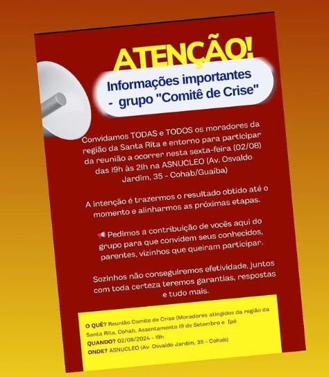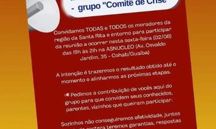 Representantes dos bairros Santa Rita, Cohab, Assentamento 19 de setembro e Ipê se reunirão na noite de sexta-feira (02), das 19h às 21h, na sede da Asnucleo, localizada na Avenida Osvaldo Jardim, nº 35. O encontro tem como objetivo avaliar os resultados das ações realizadas nas últimas semanas em resposta às enchentes que atingiram a região em maio e definir os próximos passos.