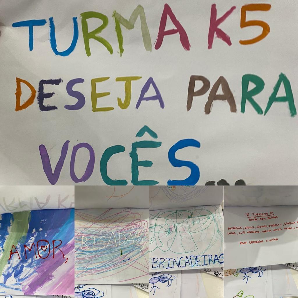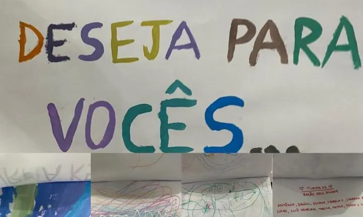 Além da doação material, os alunos da Escola Balão Azul enviaram desenhos e cartinhas com mensagens de apoio e desejos para os alunos da EMEI Maria Dinorah.