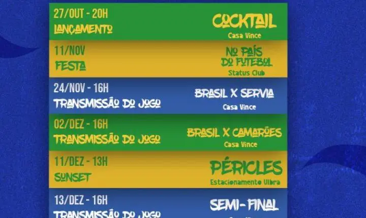 Todos os jogos do Brasil serão transmitidos na parte externa e interna da Casa Vince, com entrada franca e uma infraestrutura que inclui telão, foodpark, expositores e shows. Já, na final, em parceria com a Associação Gastronômica de Comida de Guaíba, a Fan Festival vai até o Antigo Mercado Público, levando uma super estrutura para todos guaibenses assistirem ao último jogo da Copa do Mundo.
