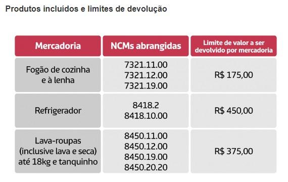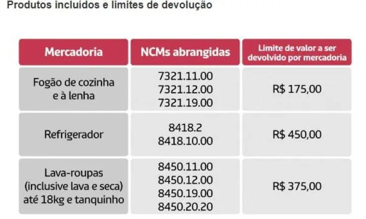 Conforme as normas do programa, cada beneficiário será ressarcido do ICMS da compra de um fogão, uma geladeira e uma máquina de lavar ou secar. Há um teto para a devolução de cada item, e a restituição do tributo poderá ser de 100% ou parcial, dependendo do valor do item e do teto de reembolso estipulado para cada tipo de produto.