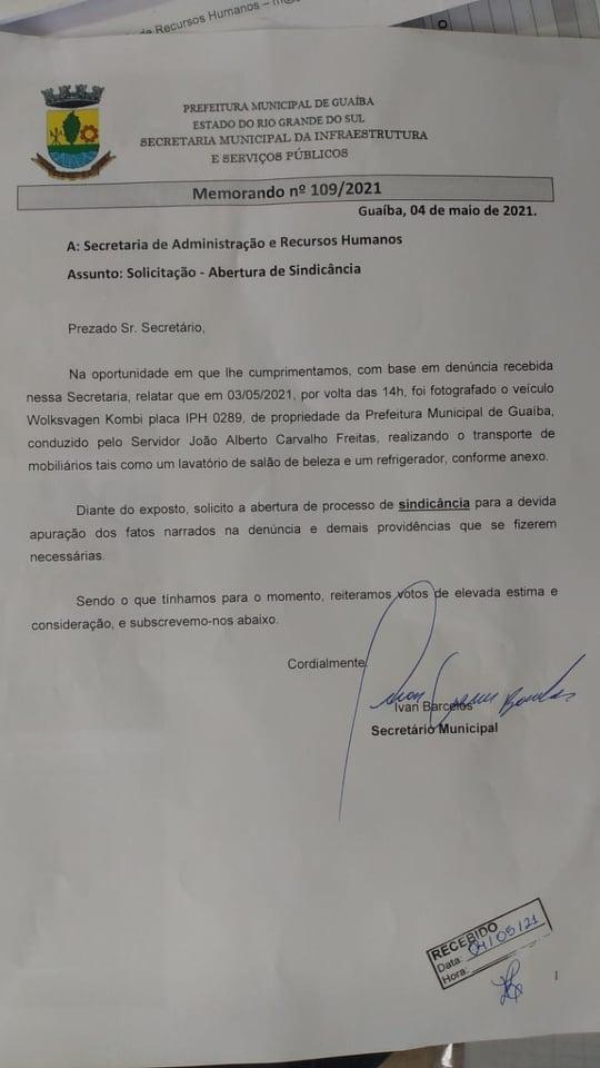 Na terça-feira (4), o Secretário Municipal de Infraestrutura e Serviços Públicos, Ivan Barcelos, emitiu o memorando oficial 109/2021, onde solicita à Secretaria de Administração e Recursos Humanos de Guaíba a abertura de um processo de sindicância para apurar o assunto. O portal Guaíba Online teve acesso ao documento (veja abaixo).