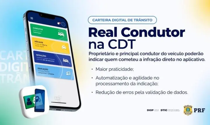 Durante a Semana Nacional de Trânsito, a Polícia Rodoviária Federal (PRF) lançou uma nova funcionalidade no aplicativo Carteira Digital de Trânsito (CDT). O recurso permite que proprietários de veículos realizem a indicação de motoristas responsáveis por infrações cometidas sem abordagem, processo que antes exigia presença física ou peticionamento eletrônico.
